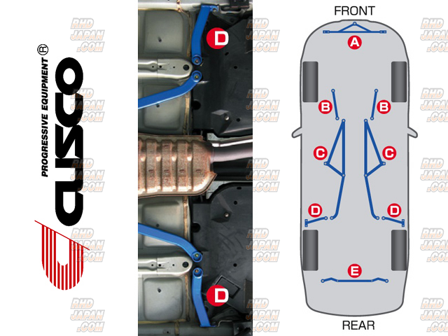 Feature: Improve chassis stiffness of the Sporty cars.- Stiffens chassis rigidity with CUSCO's essence from the motor sport participation. Not only minimizing twisting and bending inputs to the chassis and member, but mazimizes the performance of the suspension.