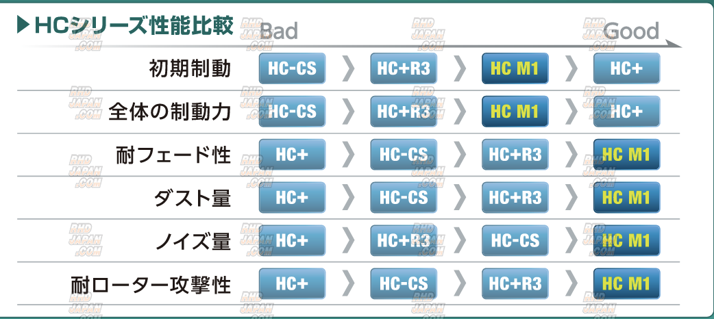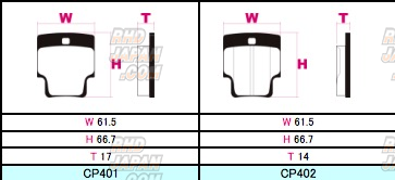 PN: CP401_HC M1These brake pads have been developed as the new flagship sports pad for street to street sport to circuit applications. With similar material and heat range from other HC (Hyper Carbon) predecessors these items have been developed for even wider range on the high end for friction coefficient. Only available for a very few dozen pad shapes used on popular sports models. Offering superb linear pedal control even up to extremely high operating temperatures. A select compound which supports driving on the street to circuit runs with vehicles equipped with high-grip radial to slick tires. Along with amazing performance the selected materials used puts out very low brake dust amongst graphite metal type compounds. Get this and all your JDM at RHDJapan!!