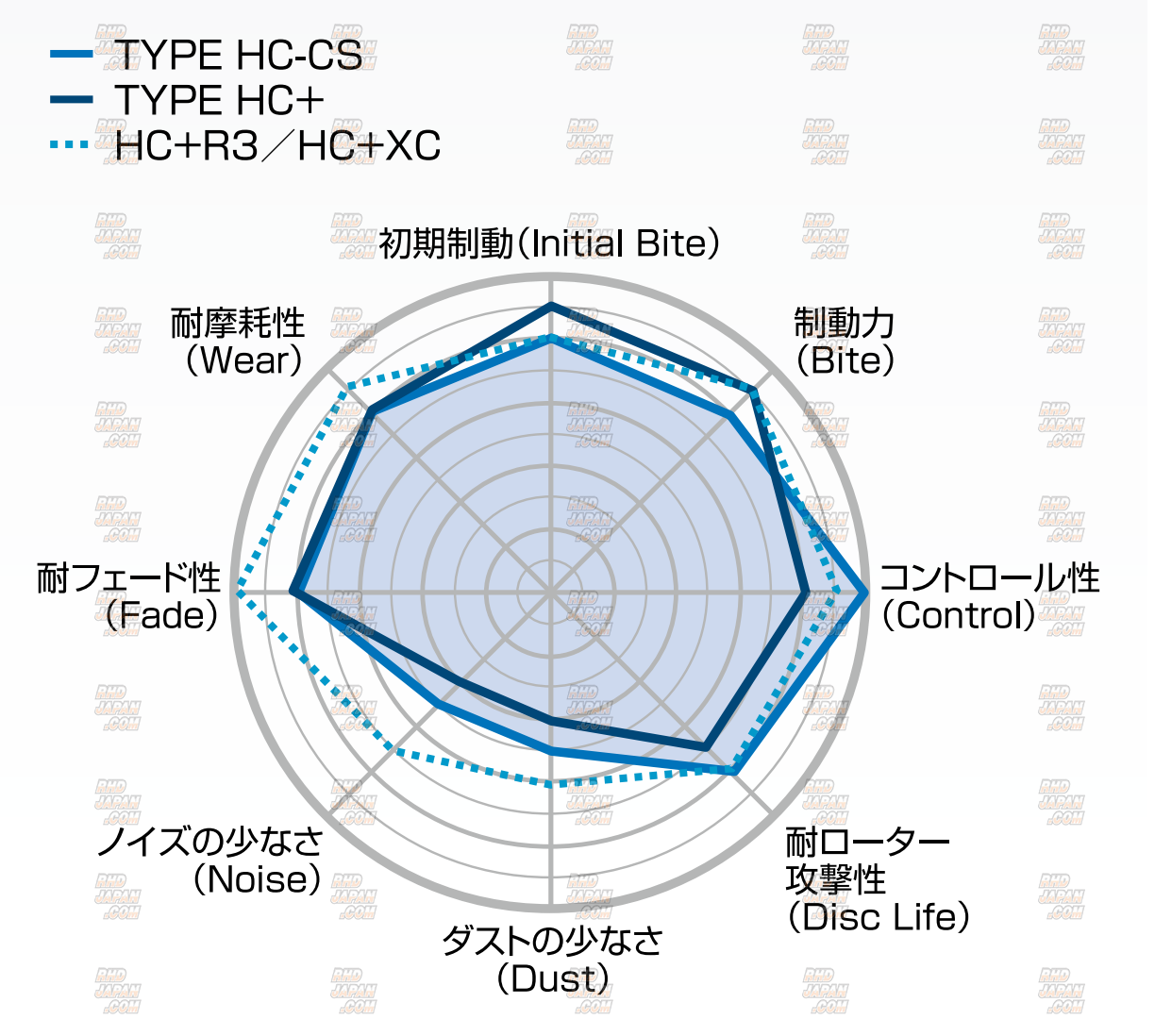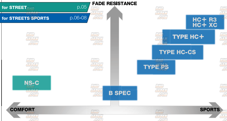 These brake pads have been designed to be highly effective on circuit to street sport applications. This specific compound was developed for realization of a linear effect with a high Mu in accordance with the stepping force from a low temperature. A model which supports diverse driving on the street to circuit runs with vehicles equipped with wide variety of tire types and compounds under a broad range of temperatures. Get the same superior quality and cost performance for European machines with these top of the line Made In Japan brake pads! Get this and all your JDM at RHDJapan!!