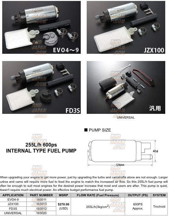 This kit will supply the excess fuel demanded on vehicles with upgrade injectors, increased boost, upgraded turbine kits, additional injectors, etc. This fuel pump is vehicle specific and will come with everything required for an easy and clean installation. Get this and all your JDM at RHDJapan!!
